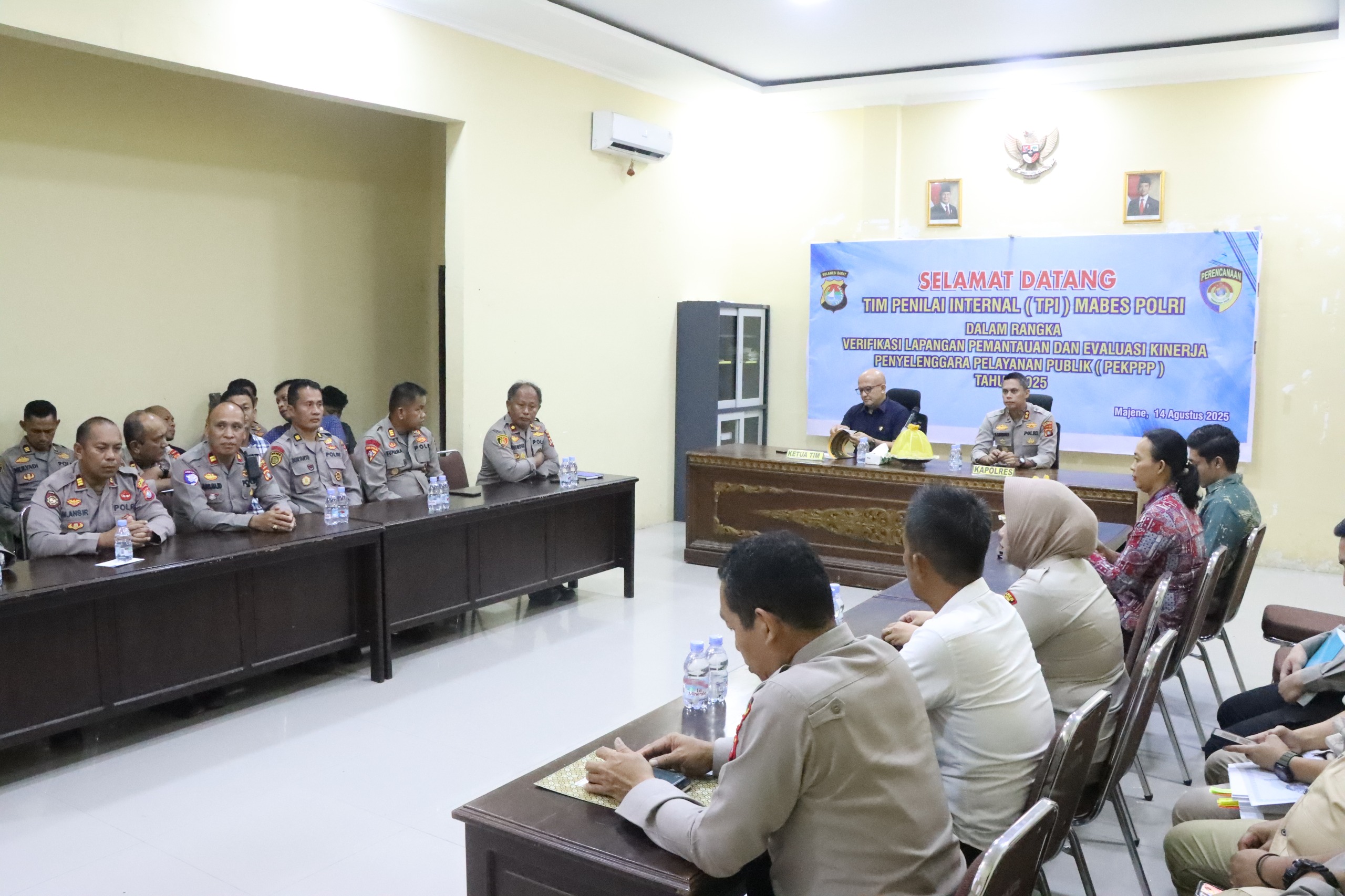 Majene, TARGETTUNTAS.ID – Kepolisian Resor Majene menerima kunjungan Tim Penilai Internal (TPI) Mabes Polri dalam rangka verifikasi lapangan pemantauan dan evaluasi kinerja penyelenggara pelayanan publik (PEKPPP) tahun 2025. Kegiatan ini dipimpin oleh KOMBES Pol Moh. Basori, S.I.K., M.M., M.H., didampingi IPTU Niluh Erni Wartini, S.H., Paur Subbagdalgar Bagdalprogar Biro Rena Polda Sulawesi Barat, Kamis (14/8/25).