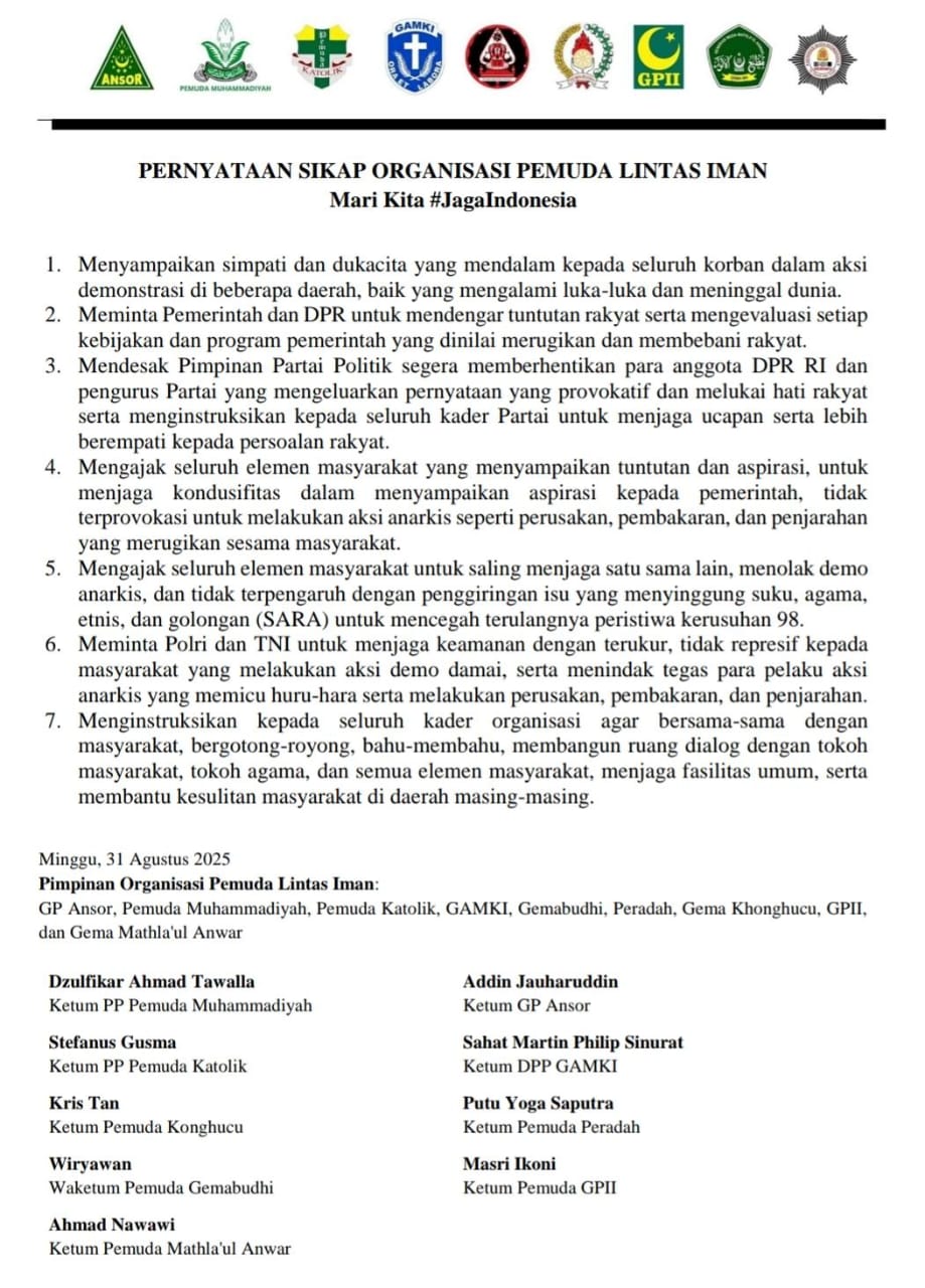 Dalam pernyataan sikap yang dirilis pada Minggu, 31 Agustus 2025 itu, organisasi pemuda lintas iman menyampaikan duka cita mendalam kepada para korban aksi demonstrasi, baik yang mengalami luka-luka maupun yang meninggal dunia.