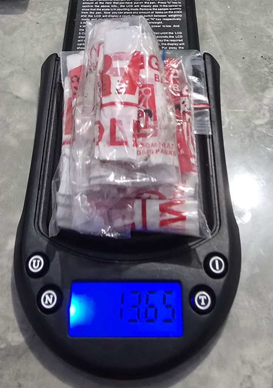 Secara keseluruhan, petugas berhasil mengamankan 21 (Dua puluh satu) saset plastik bening berisi sabu dengan total berat 13,65 gram, serta barang bukti lain berupa potongan lakban, pipet plastik kecil, dan satu unit handphone.