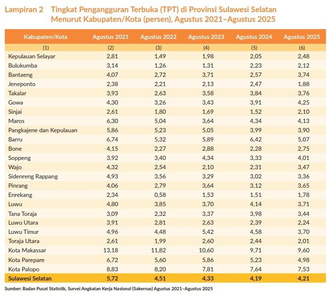 Berdasarkan data BPS, Parepare tercatat memiliki tingkat pengangguran lebih rendah dari rata-rata Provinsi Sulawesi Selatan yang pada Agustus 2025 berada di 4,21 persen. Angka ini menempatkan Parepare sebagai salah satu kota dengan kinerja penyerapan tenaga kerja cukup baik di wilayah utara Sulawesi Selatan. ***