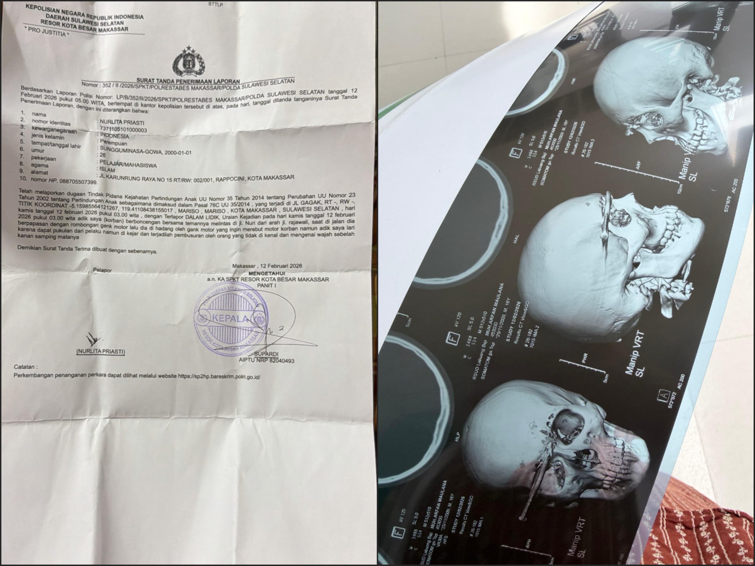 Pihak keluarga korban telah melaporkan kejadian tersebut ke pihak kepolisian Polrestabes Makassar untuk penanganan lebih lanjut.