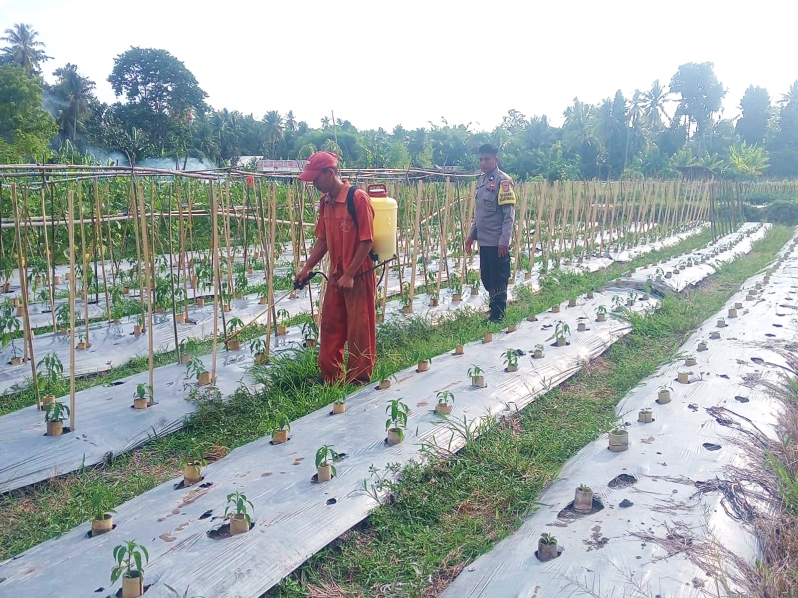 Dalam kegiatan tersebut, Aiptu Hadis tidak hanya melakukan pemantauan, tetapi juga aktif mendampingi petani binaannya dalam merawat tanaman cabai agar tetap tumbuh optimal. Salah satu upaya yang dilakukan yakni dengan melakukan penyemprotan pestisida guna mengusir hama yang berpotensi merusak tanaman.